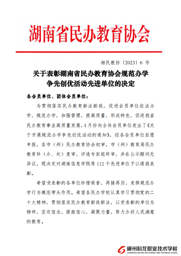 3月6日上午,湖南省民办教育协会2022年度会员代表大会在长沙隆重召开。湖南省民办教育协会开展的“规范办学争先创优”活动结果揭晓。我校经市民办教育协会初审、市教育局民办教育科复审,评选专家组终审,郴州市科龙职业技术学校获评湖南省民办教育协会“规范办学争先创优活动先进单位”称号,郴州市仅有1所中职学校获得此荣誉。