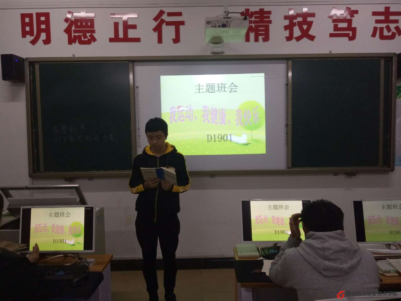 2019年10月28日D1901班为了配合学校运动会的举行,开展《我运动、我健康、我快乐》的主题班会,每位同学轮流发言,旨在发动同学们积极参与体育锻炼,全面提高个人自身素质。