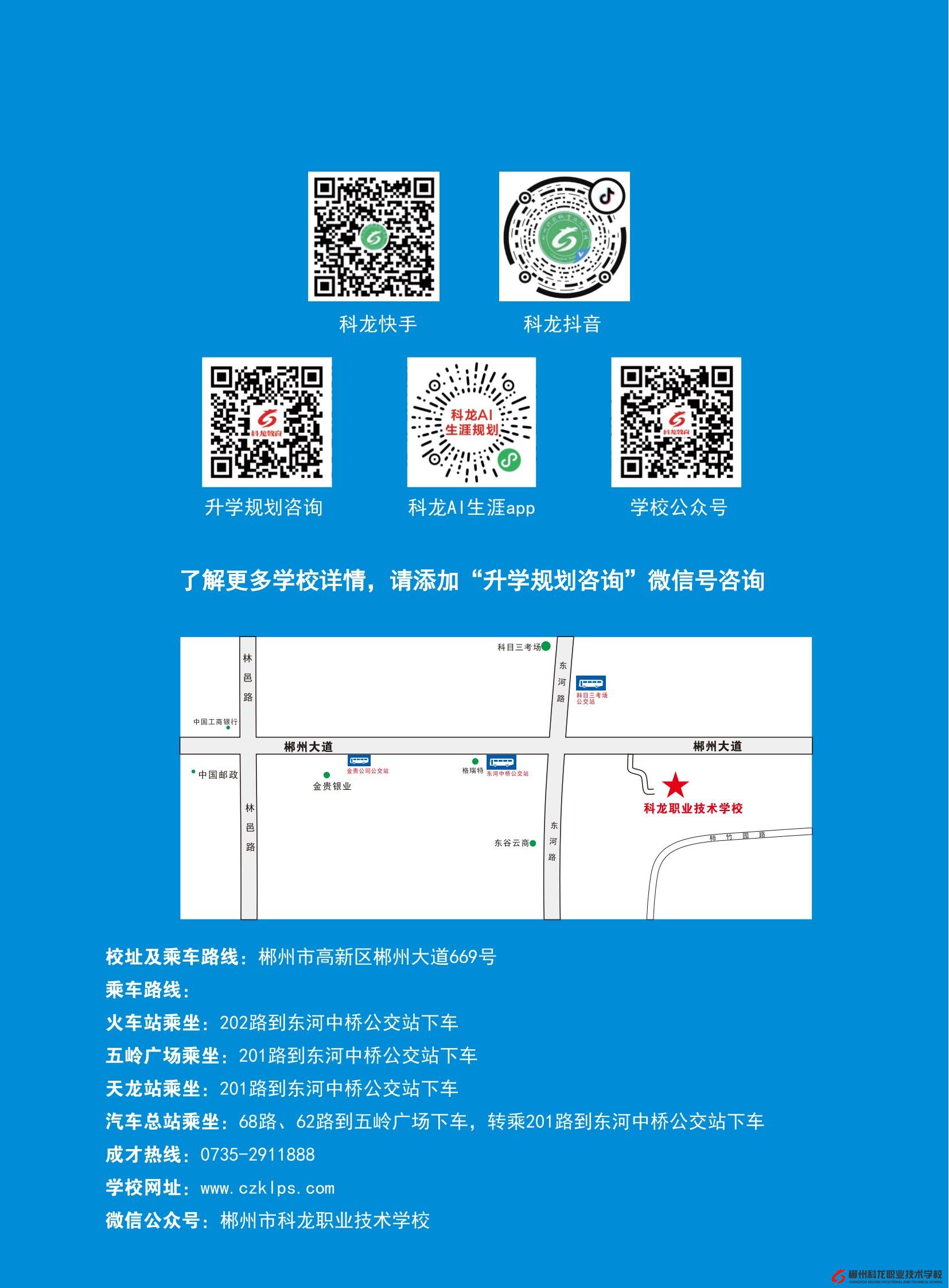 (1)按郴州市教育局的招生录取要求,应届初中毕业生在“郴州市中考招生录取系统(http://www.czzslq.com)”,填报“郴州 市科龙职业技术学校”志愿。考生登录系统的用户名为本人的学籍号(见中考准考证),初始密码为考生身份证后6位数字, 或者关注我校微信公众号用手机填报志愿更方便。